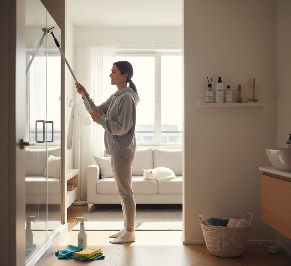 - 水を切る: スキージー(水切りワイパー)で壁や鏡の水分を取り除きます。これが最強のカビ予防!マグネットで壁につくタイプなら収納もスマートです。