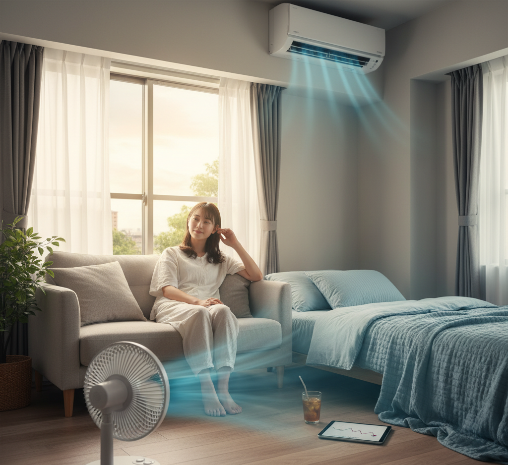 - 【+α】:サーキュレーターを併用し、完璧な冷気を部屋の隅々まで行き渡らせる。